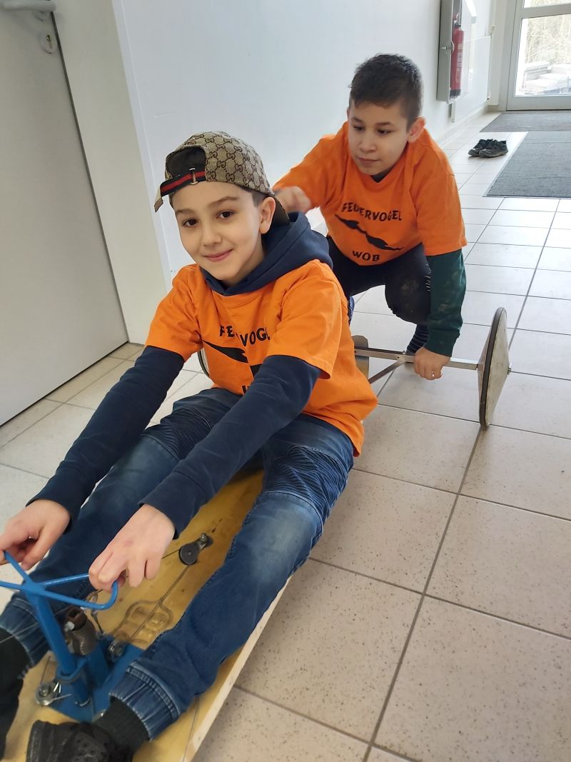 Nach einigen ersten Fahrübungen im Flur, wurde die Seifenkiste für die technische Aufbereitung auf die Böcke gepackt und zerlegt.